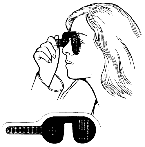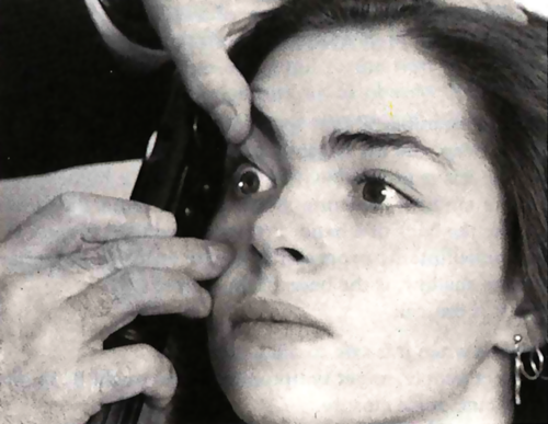 Figure 3: The disc with the pinhole should be held about one inch (2.5cm) before the eye. Leaning on the cheek keeps it steady. Multiple pinholes do not place such a premium on steadiness. And usually one wil be found by the patient. The pinhole can be used for near vision as well. The capacity to make out the smallest print, despite a poor performance for distance, indicates an intact macula. No improvement with a pinhole means the problem is not a refractive error.