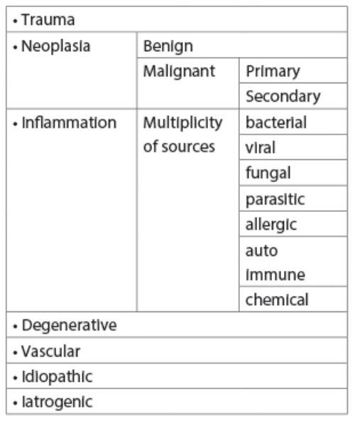 All parts of the body can be damaged by something out of the pathological canon but the list of potential causation is the same, no matter what part is affected: