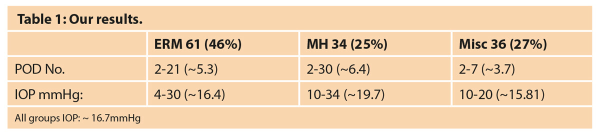 The ERM group were seen an average of 5.3 days postoperatively (range 2-21 days) with an average IOP of 16.4mmHg (range 4-30mmHg). The MH group were seen an average of 6.4 days postoperatively (range 2-30 days) with an average IOP of 19.7mmHg (range 10-34mmHg). The Misc. group were seen an average of 3.7 days (range 2-7 days) postoperatively with an average IOP of 15.81mmHg (range 10-20mmHg).
