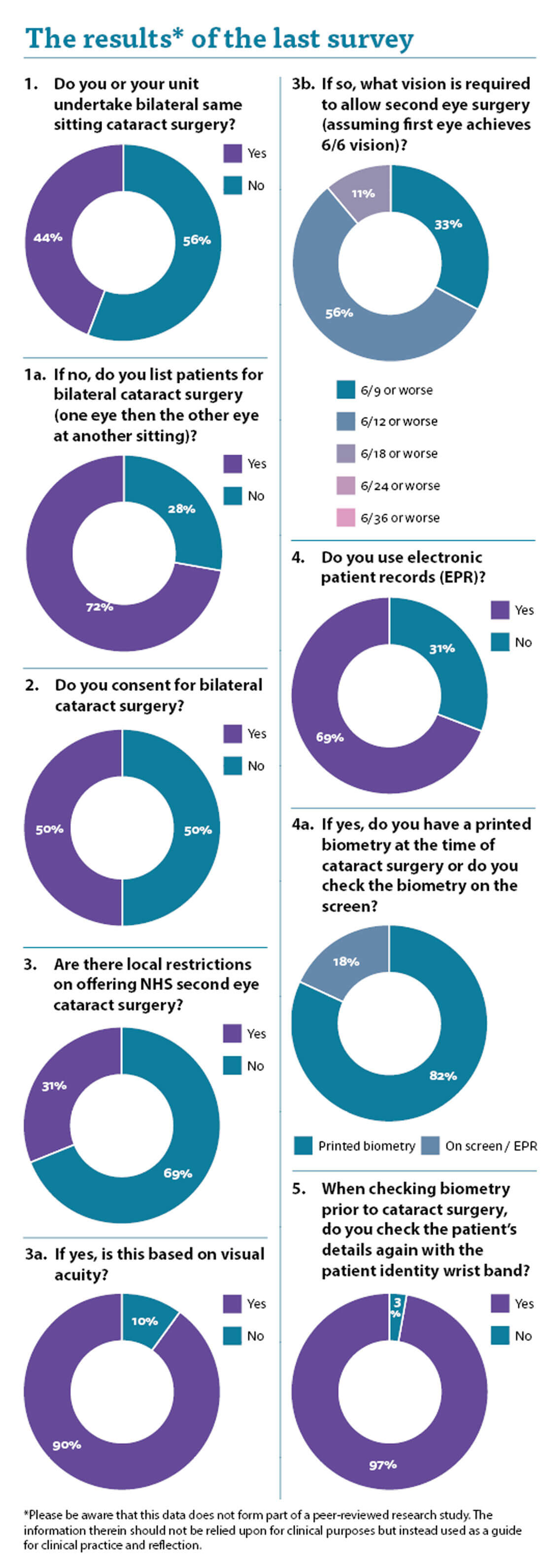 The answer to the first question was interesting in that it seems an increasing number of units are doing same-sitting bilateral cataract surgery. It is becoming accepted practice and mainstream.