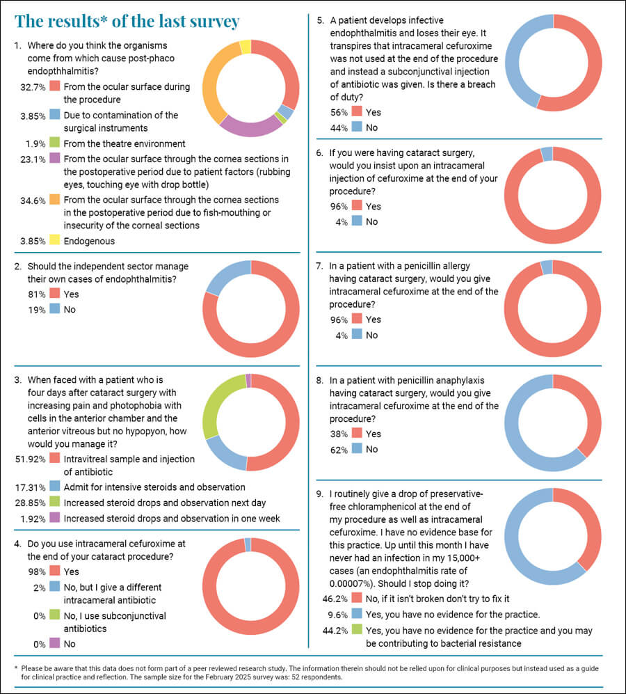 I asked you this question and deliberately allowed only one answer as I wanted to force a choice when we all know it could be any of the responses. A third of you felt that the infective organism was introduced at the time of the procedure, while a further third felt they entered the eye from the ocular surface through the corneal wound in the postoperative period. One fifth of you felt that patient factors, such as patients rubbing their eyes, were at play.
