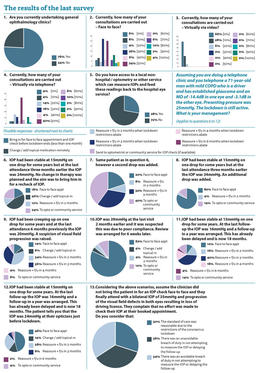 It is clear that our services have been markedly disrupted. Three quarters of us are seeing 50% or less of our patients face to face in clinics, with a lot of us telephoning patients for their consultations. I have done my fair share of trying to guess the intraocular pressure (IOP) from the timbre of the patient’s voice over the phone and the jury will remain out for some time as to whether I am getting it correct.