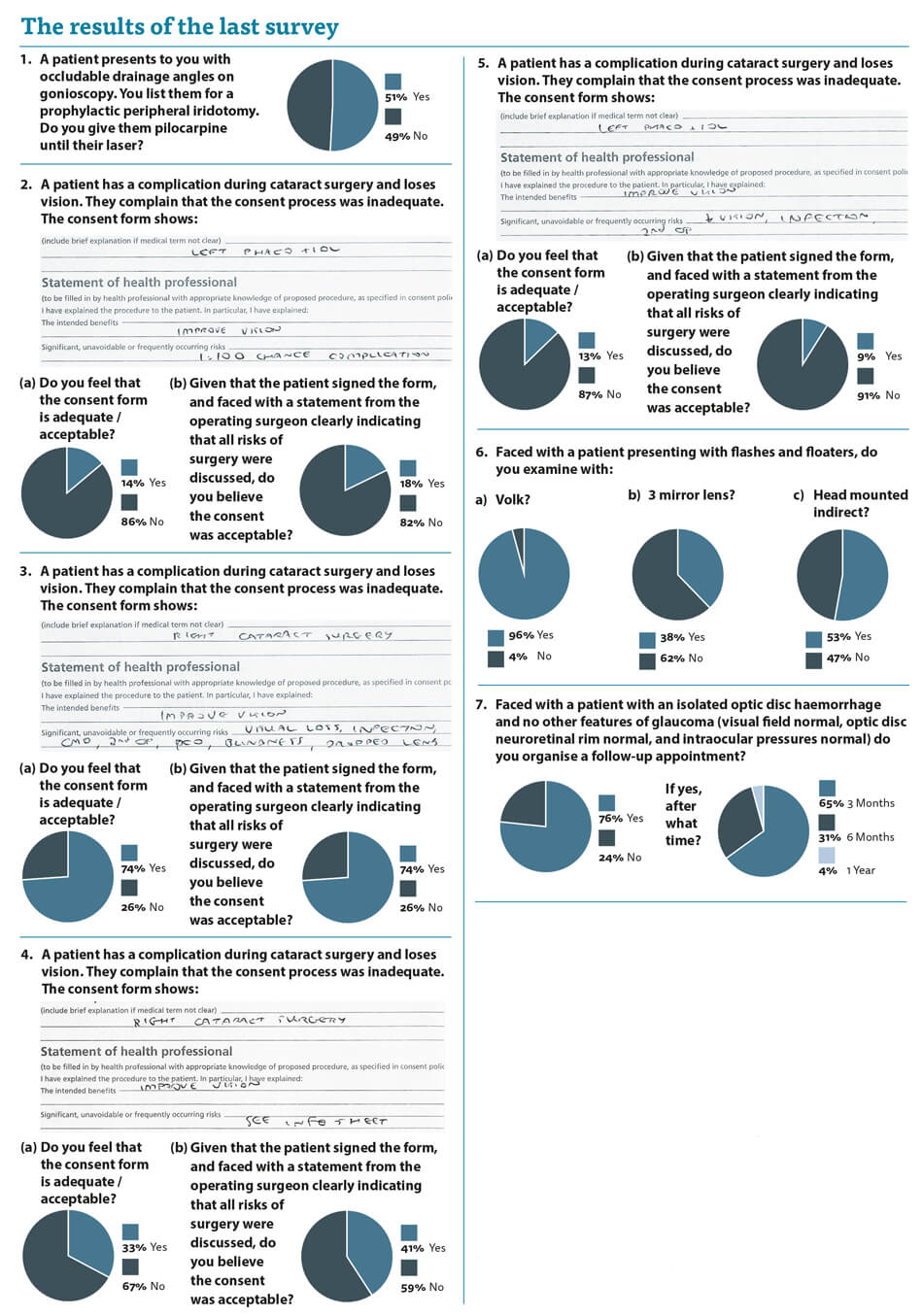 The readership seems underwhelmed with the consent forms presented and only one of them (the one I actually use) gained any support. Even that consent form was deemed to be unacceptable by a quarter of respondents. It is clear that there is no support for consent forms with “see information sheet” and “1 in 100 risk of complications” so I would ask clinicians to stop writing this in isolation as it makes it extremely hard to say the consent process was adequate.