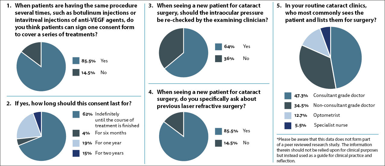 When faced with this question the vast majority of you (85.5%) felt that one consent form can cover a series of treatments, such as intravitreal or botulinum toxin injections. I feel this is reasonable, however, it is always worth reminding the patient of the rationale behind their treatment and giving them the opportunity to ask further questions if they wish.