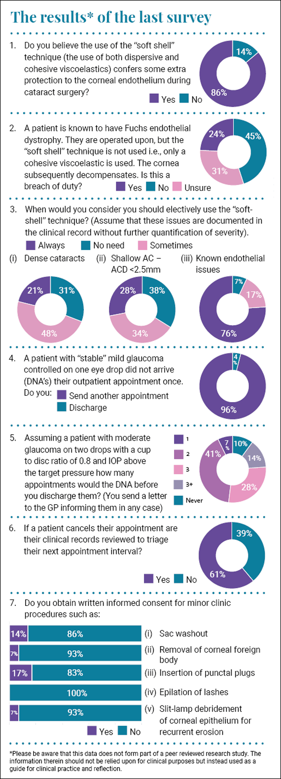 When I asked you whether you felt that the use of the soft-shell technique confers some extra protection to the corneal endothelium during cataract surgery, 86% of you agreed with me. Interestingly, 14% of you did not. If those 14% do not use the technique then they need to be able to robustly explain why if the cornea does decompensate. Almost inevitably they could face allegations that they should have used it.