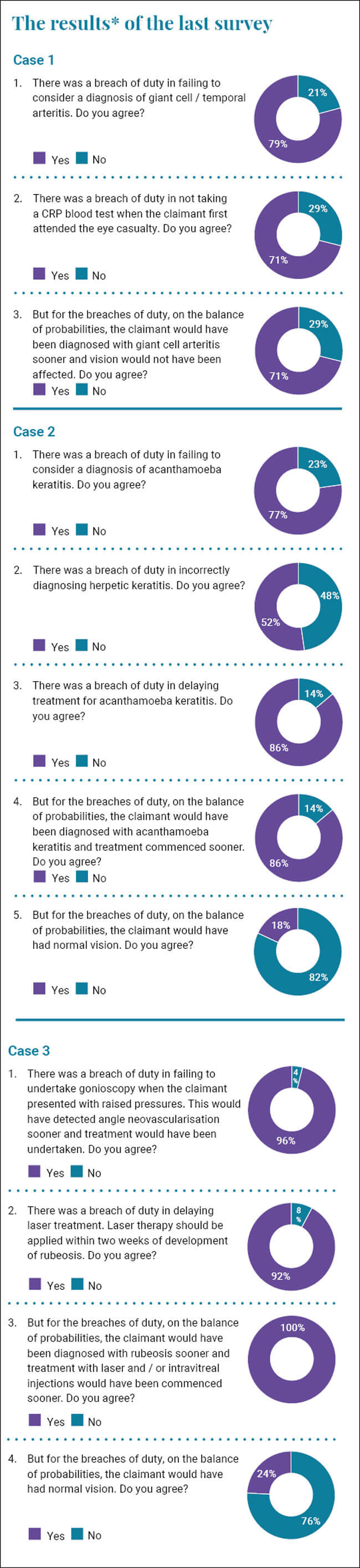 Almost 80% of respondents felt that there was a breach of duty in failing to consider the diagnosis of giant cell arteritis (GCA) while almost one in five felt that it was not a breach. Two-thirds felt it was a breach of duty not to undertake a CRP blood test and the same number feel that if the blood test had been done, the vision would have been spared.
