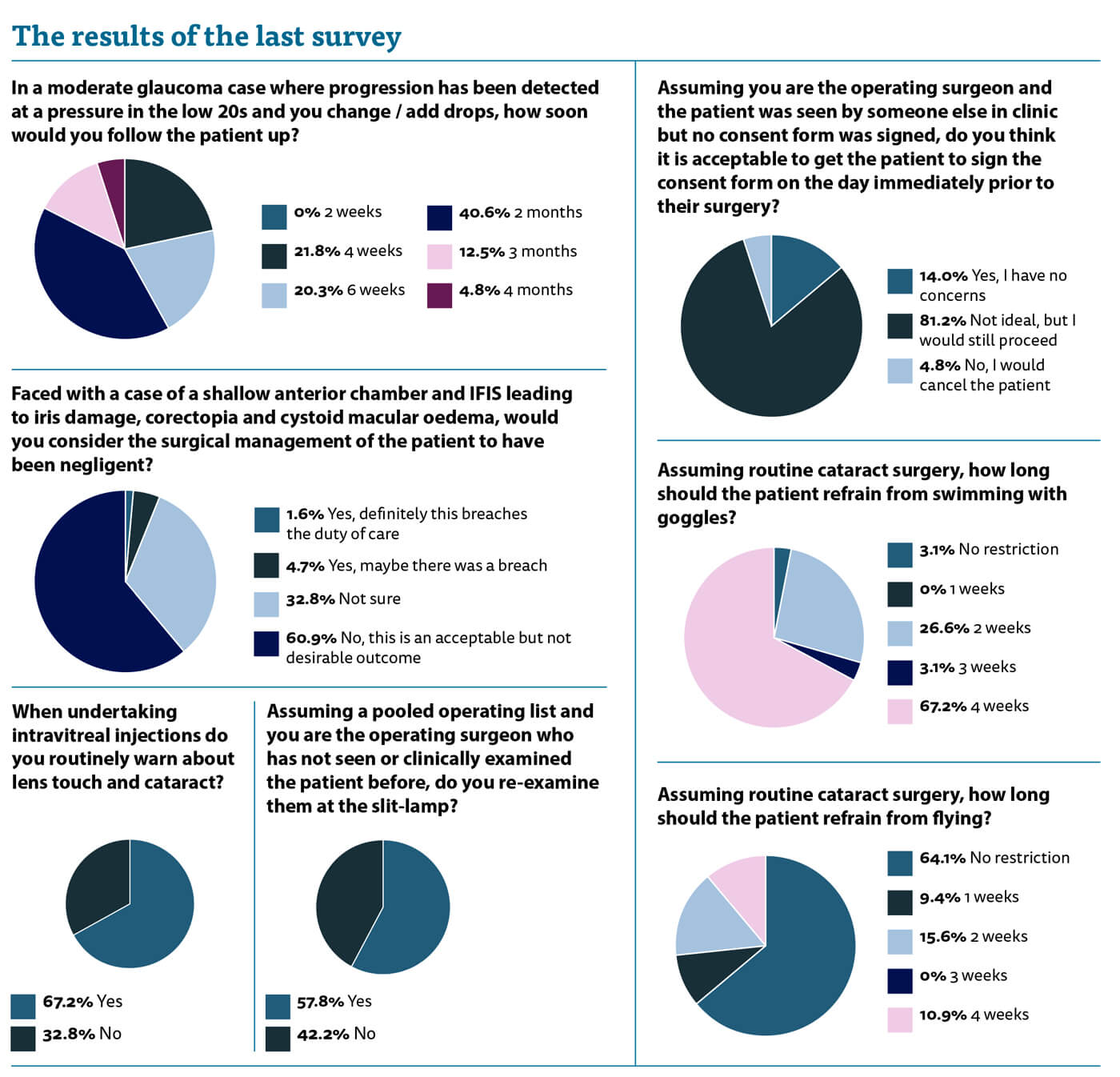 The final two questions highlight the massive variability in the advice we give our patients after cataract surgery. Although for us it has little impact, for the patients it can have a significant impact on their lives. Ten percent of respondents tell their cataract patients that they cannot fly for a month. This will impact adversely on holidays and plans to visit family etc. Why does one surgeon indicate no restrictions but another state a month? Personally, I ask them not to fly away in the first two weeks after surgery as this is a critical period for postoperative complications and I would rather they were around for me to look after them in case they run into problems. Furthermore, I always warn them that if something does go wrong and I need to keep them their travel insurance company may not cover it as the operation was elective.