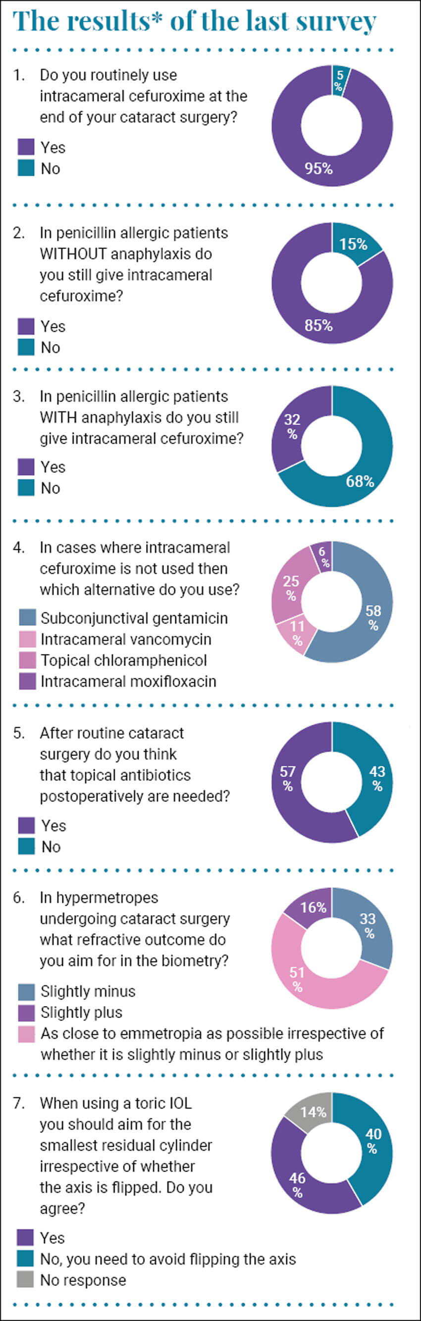 For the first time we have had some recurrent questions. I initially questioned you on the use of intracameral cefuroxime (ICC) in penicillin allergy back in 2019. I reiterated the questions in this survey to assess change. For certain issues I was surprised to see that very little had changed.