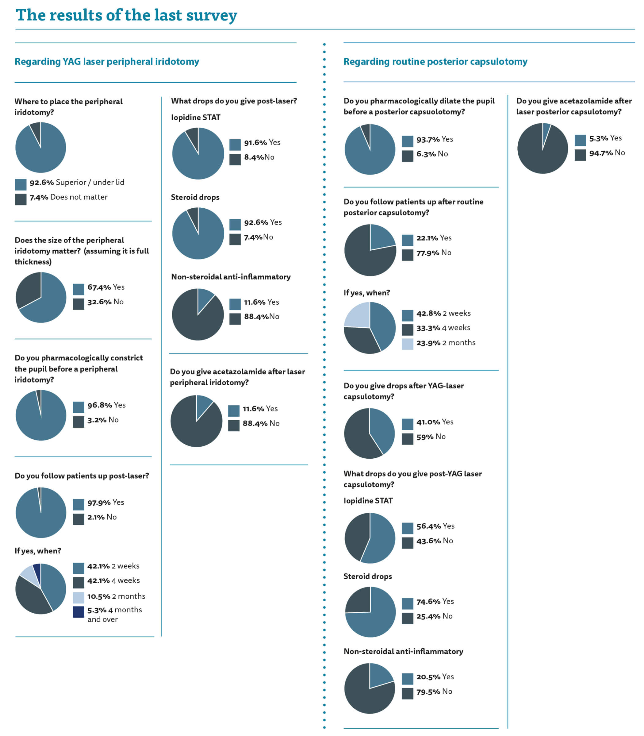 Again, we see variation but this time we seem to be more in agreement. We all tend to pharmacologically miose the pupil prior to peripheral iridotomy and dilate the pupil prior to posterior capsulotomy. Most of us agree that a peripheral iridotomy should go under the eyelid and two-thirds of us believe that size does matter. Consensus seems to be strong that such patients require a follow-up appointment between two and four weeks after their laser.