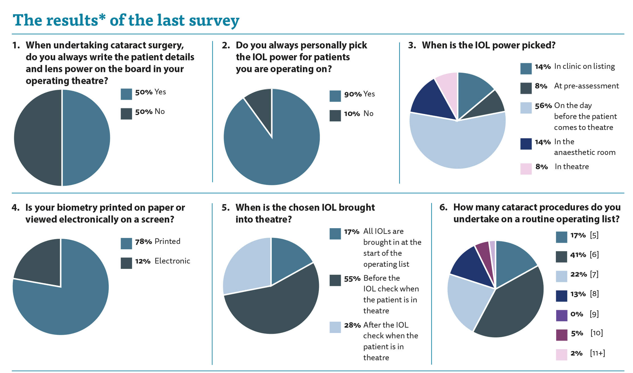 Sixty-four percent of respondents chose the IOL power at the pre-assessment visit or on the day before the patient comes to theatre and, personally, I feel this is best practice. Twenty-four percent of you chose the IOL power in the anaesthetic room or in theatre. I worry that this is leaving the door open for error. You are in the midst of doing several things and you are not focussed on the notes, the measurements and the biometry.