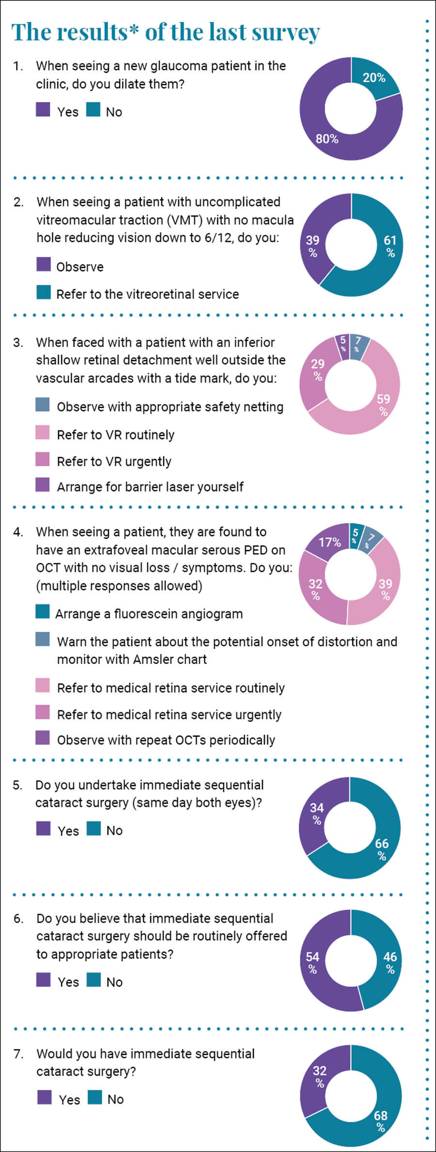 I see patients in the next clinical category frequently and was again surprised at how we vary in our decision-making. In a patient with an extrafoveal serous pigment epithelial detachment what would we do? We were surprisingly split in our opinions. Two thirds of you would refer to the medical retina (MR) service with half of you doing that urgently. Seventeen percent would observe with regular OCTs while 7% would discharge with an Amsler chart. I observe these patients with safety netting and repeated OCTs. They often resolve without any adverse sequelae. Seeing that two thirds of you refer to MR makes me question what I do. Am I incorrect in my management? I know I am not breaching my duty of care as a responsible body of medical opinion (the 17% of you who agree with me) would support me, but am I doing the best for the patient? I will reflect.