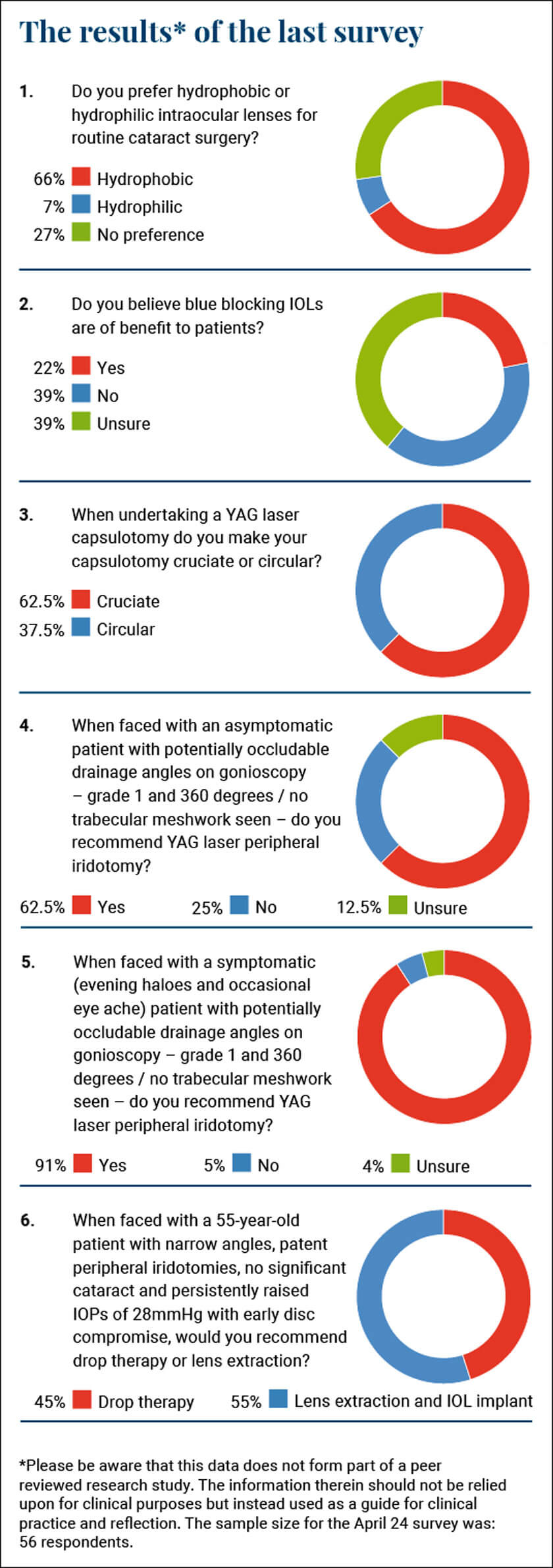 When I was in my training and even in my early years as a consultant, I did not fully understand the difference between different lenses. When asked my preference of hydrophilic versus hydrophobic intraocular lenses (IOLs) I really did not have any opinion at all and simply used what my unit used without completely understanding the nature of the lens. It turns out that it was a hydrophobic acrylic IOL and ever since those years I have continued to favour them. Two thirds of you agree that they are your preferred IOL choice with only 7% opting for a hydrophilic and 27% with no preference.