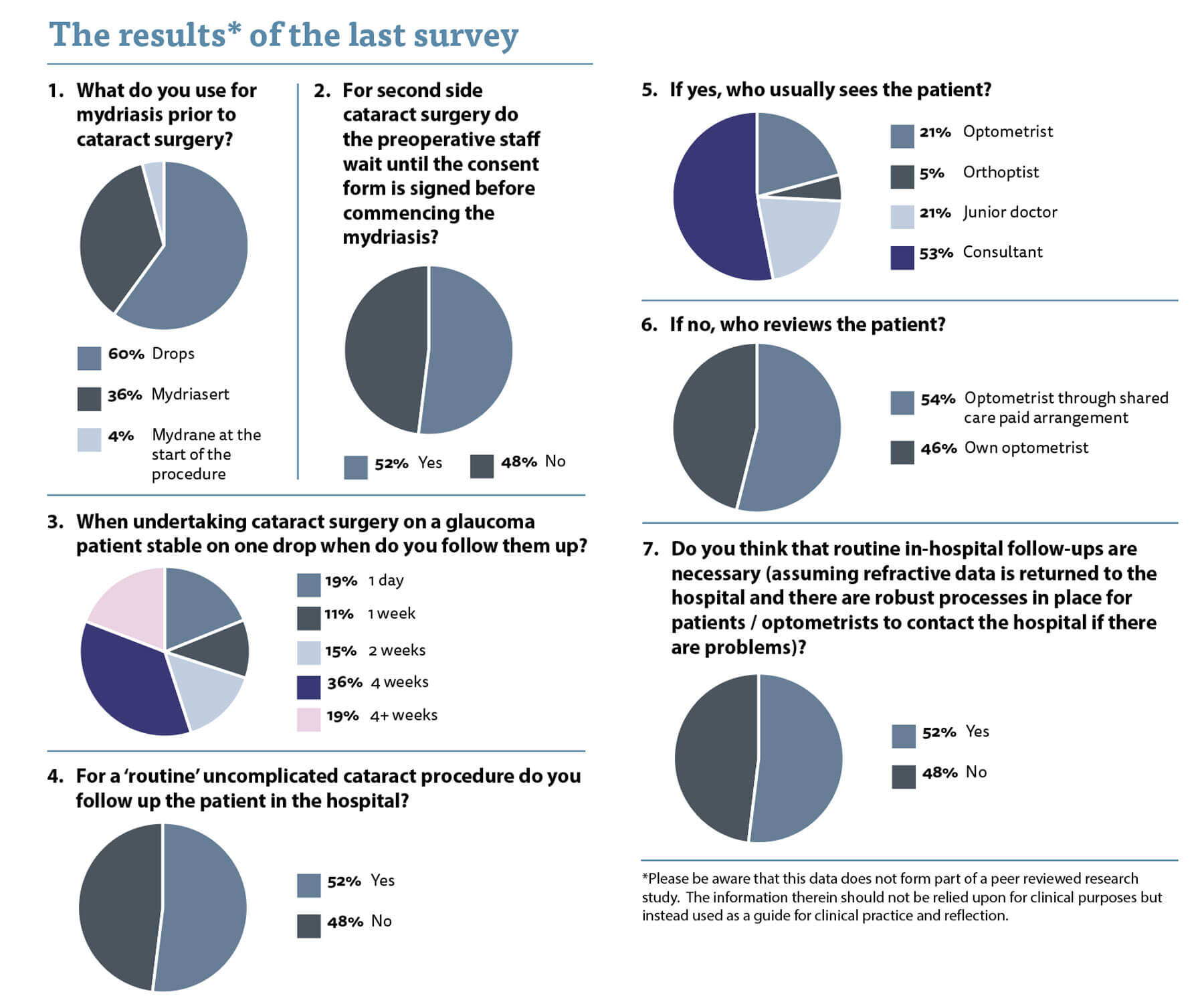 Again, we had a Brexit split on the issue of follow-up for routine patients after their cataract surgery. I personally do not think that patients need to be seen in the hospital after their surgery. I believe the safety profile is so good and the pick-up rate of problems at a routine follow-up so low. They go back to their optometrist anyway for refraction and new spectacles, so it makes sense they use their skills to assess the eye for us. Avoiding extra visits to the hospital is also more important now in the era of COVID-19. We also need feedback on refractive outcomes, vision and the presence of any postoperative issues and some optometrists would like renumeration for this extra work. I prefer to leave those discussions to the managers and commissioners. I note more than 50% of those who did send the patient to their optician for follow-up had some form of paid shared care arrangement.
