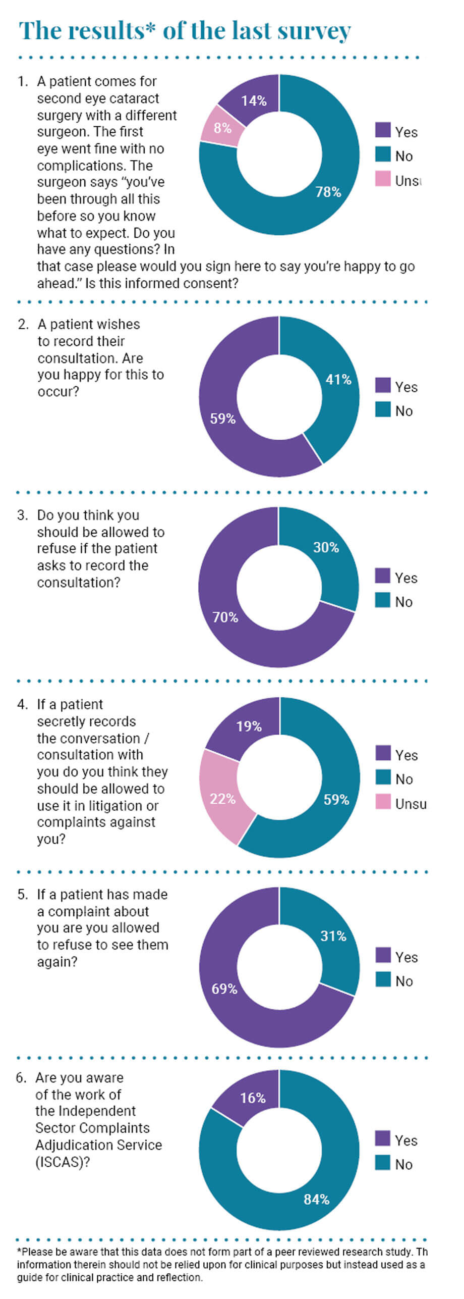 With smart phones being used more and more frequently, it is getting easier for patients to record their consultations. I have been involved in several cases where patients have covertly recorded their consultations, or, more commonly, follow-up appointments when things have not gone to plan, and the contents of these records are uncomfortable. They are professionally transcribed and make difficult reading sometimes. It is easy for us to come off as condescending and dismissive in our conversations, and we must consciously make efforts to avoid this perception. Fifty-nine percent of you were happy for patients to record their consultations, while 41% of you were not. I get asked questions on this topic frequently after my talks and teaching sessions. My response to this is that I cannot see any reason why we would not allow our patients to record their consultation. We need to inform the patient about their condition and treatment options, and we want to empower them to make decisions about their care. If they want to listen back to the recording or share the information with a relative to help do this, then I can see no ethical or reasonable objection. It may even be deemed to be essential under the equalities legislation when a patient may struggle to absorb all the information in their appointment. I would ask: “What have we got to hide?”