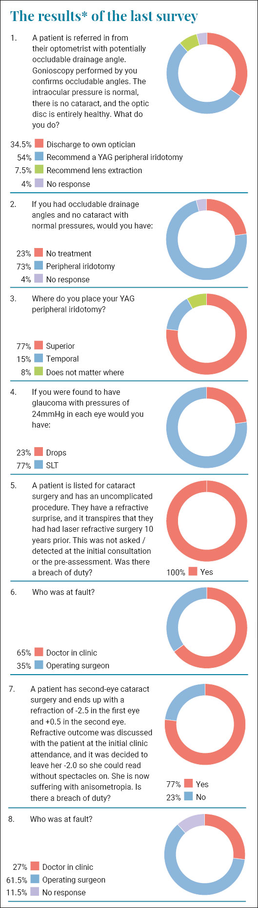 What is fascinating is that when you are the one who has the occludable angles more than 70% of you would elect to have the iridotomy. This goes against the evidence base and guidelines. It also raises an ethical question of why we would have it ourselves and yet would not recommend it for patients? I explain to my patients the pros and cons of treatment and then they make an informed choice as to how they wish to proceed. I have been asked on many occasions what I would do and I answer that I would have the laser. Maybe seeing the misery and pain endured by patients who have had acute angle closure I am swayed into avoiding that scenario at all costs.