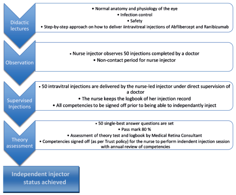 Training of nurse practitioners to perform intravitreal injections at the Great Western Hospital consists of the following components (Figure 2):