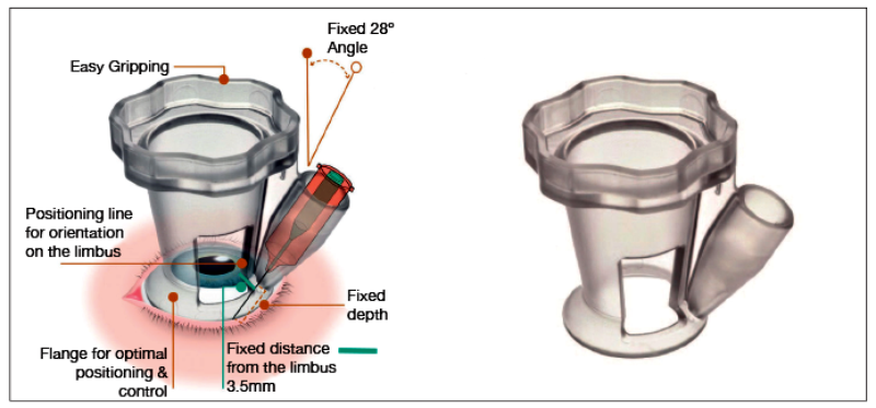 Pre-filled syringes for ranibizumab treatment have been developed to reduce preparation time and variation in preparation steps [13]. In addition, injection assistant devices such as the InVitria® (FCI Ophthalmics, USA) and SP.eye™ (Surgitrac Instruments, UK), have been developed to aid with identifying injection location (Figure 1), further reducing the preparation time and preventing the injecting needle from coming into contact with the eyelashes and eyelid [14]. InVitria® is made from a transparent polycarbonate mould that fits around the cornea with a central window allowing for patient fixation. There is a 28-degree-angled, guide tube which the needle passes through, delivering the injection at a fixed distance of 3.5mm from the limbus [14].