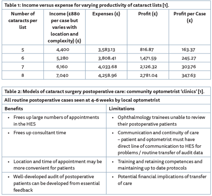 The target of departments performing one cataract operation every half an hour is not being routinely achieved and National Health Service (NHS) providers should look for opportunities to streamline processes to achieve “higher volume” surgery to secure greater economic efficiency. High volume cataract lists need adequate support but are cost-effective, i.e. reduced cost per case (Table 1). The income generated needs to be retained and reinvested in local eye care services rather than diverted elsewhere by the trusts in which they are housed. For postoperative care and discharge policies, only 11% of interviewees in The Way Forward Project reported that ophthalmologists routinely review cataract patients postoperatively. Cataract follow-ups are seen by non-ophthalmologists in 90% of cases and over 25% of these are discharged directly to the community (Table 2).