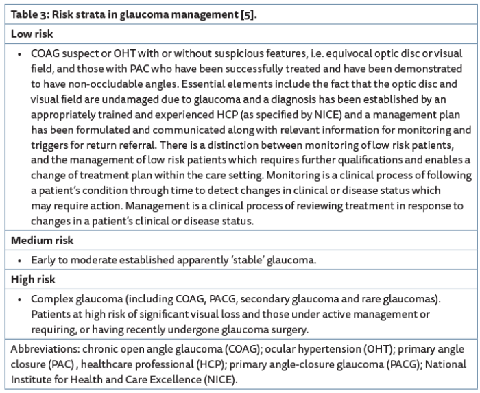 The key to organisation of a glaucoma service by a multidisciplinary team (MDT) is stratification of patients into low, medium and higher risk categories, defined in the National Institute of Health & Care Excellence (NICE) accredited RCOphth glaucoma commissioning guideline (Table 3) [5]. Low (OHT / suspects) and medium (‘stable’ treated glaucoma patients) risk patients can be managed by a virtual follow-up service or by suitably trained healthcare professionals with limited consultant input. High risk complex cases are seen by ophthalmologists, commonly with a subspecialty interest.