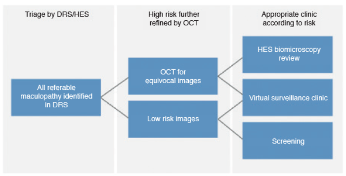 The population with DR is projected to increase by between 20% and 80% in the next 20 years. Approximately 50% of referrals from the DR screening (DRS) service are at low risk of vision loss. Referral refinement using OCT virtual review of DR referrals is becoming increasingly common, experience showing that this could divert over half away from hospital ophthalmology clinics with patients having low risk OCT images diverted back into screening or into a surveillance clinic (Figure 2). If all referable maculopathy is being reviewed face to face in the HES, practitioners might consider reviewing the images and categorising cases as: a) high risk - must be seen in HES; b) low risk - can be seen again in the DRSS in six months; and c) equivocal - could have an OCT and then decision made as to appropriate review. If this produces a useful reduction in patient numbers, then units might review the possibility of training for a non-medical healthcare professional, or move the task into the DRSS itself.