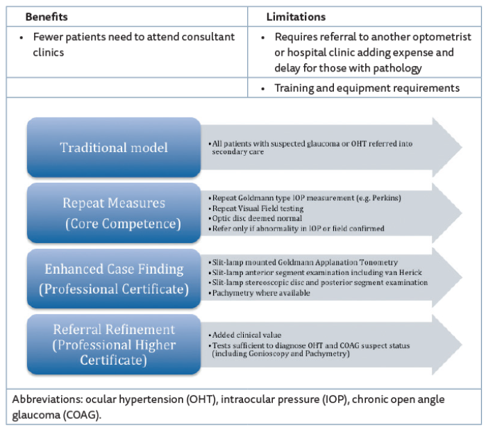Glaucoma management accounts for 20% of current ophthalmology hospital outpatient activity. Over the next 10 years, glaucoma cases are predicted to rise by 22%, glaucoma suspects by 10% and ocular hypertension cases by 9%. It is likely that a progressively greater percentage of prevalent cases will be detected and diagnosed with improvements in technology. Glaucoma referral filtering schemes (GRFS), refining referrals by interim assessment by non-ophthalmologists, can be used to improve accuracy of assessment prior to hospital referral and reduce false positive referrals (Figure 1).