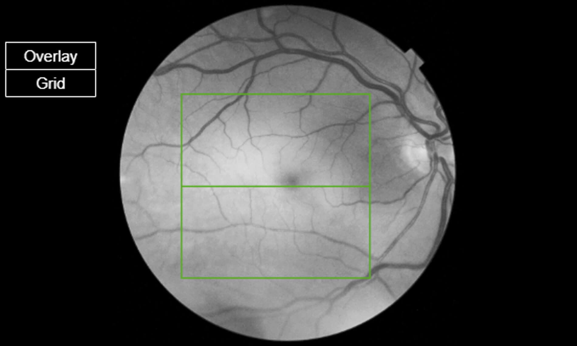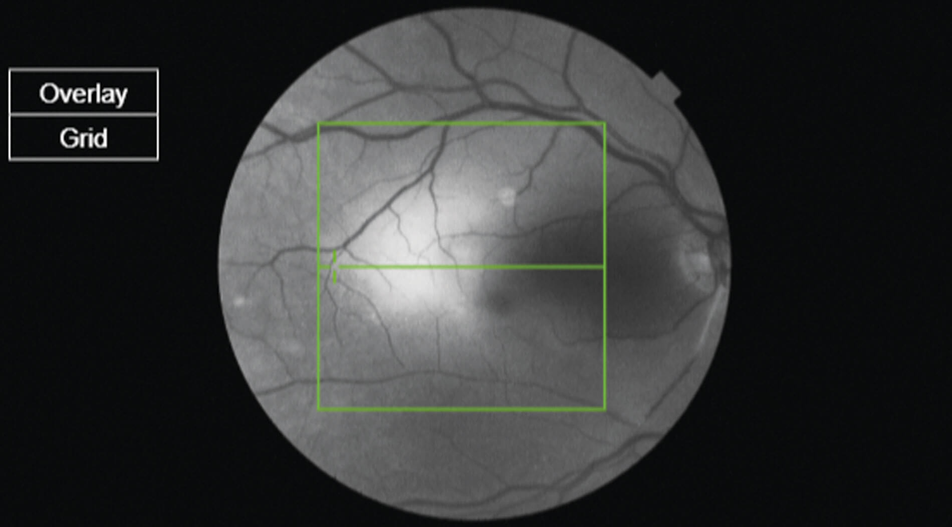 Figure 3: Red free image of the right macula showing ischaemic oedema (white bright signal).
