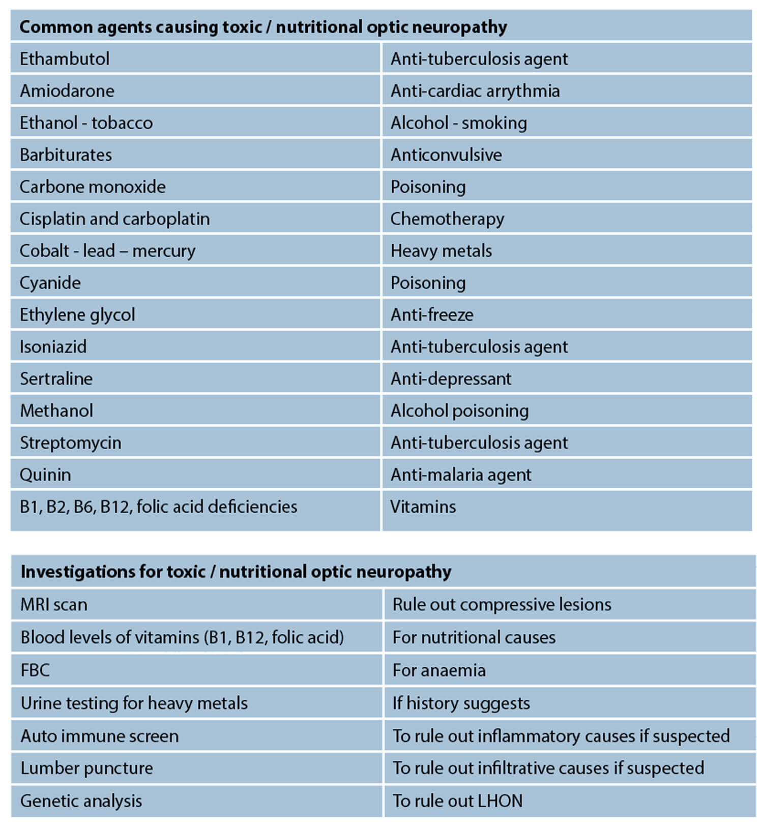 Isoniazid: very similar to ethambutol and more of a concern if both medications are combined. Methanol: severely damaging toxic agent which can lead to acute loss of vision bilaterally, but the history clearly differentiates this.