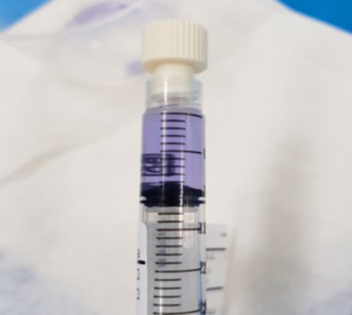 An investigation concluded that the error stemmed from a 10mg vial being selected instead of a 2mg vial. Reconstitution with 10ml sterile water created a solution of 1.0 mg/ml, which was five times the strength requested and would have accounted for the unusually deep blue / purple hue (Figures 1 and 2).