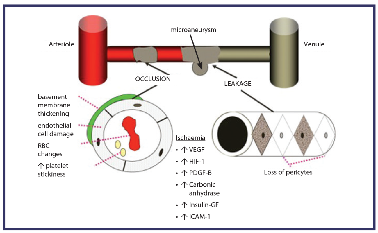 Figure 1: Diagrammatic representation of changes to vasculature in diabetic retinopathy and cytokines involved.