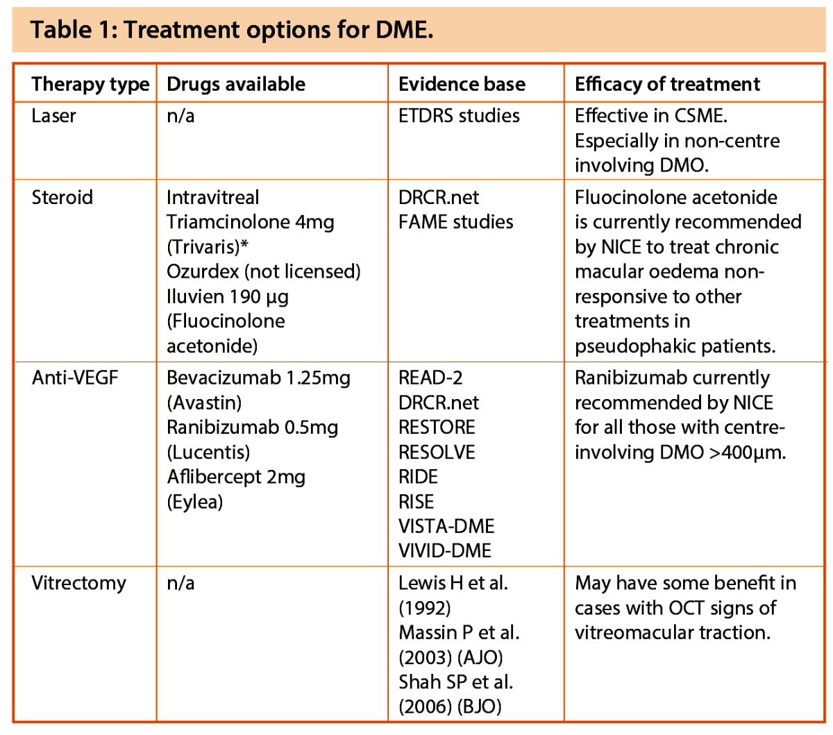 Since the EDTRS trials, a myriad of treatment options have become available for the treatment of DMO (see Table 1). It is now the clinicians’ responsibility to sift through these various trial data, to determine which treatment option or combination to use to get the best results for our patients. These treatment options can be broadly divided into the following: