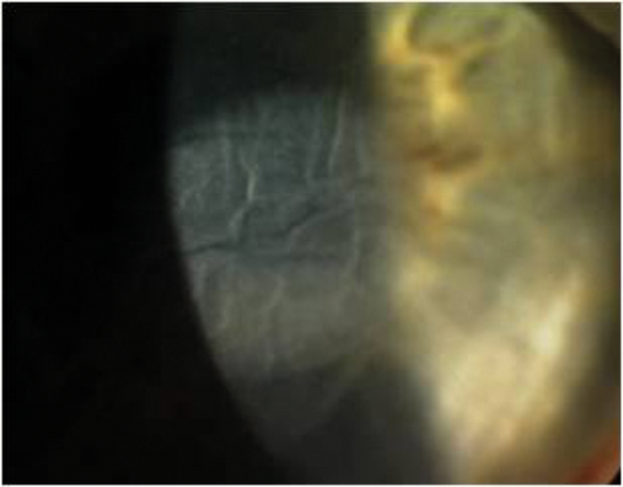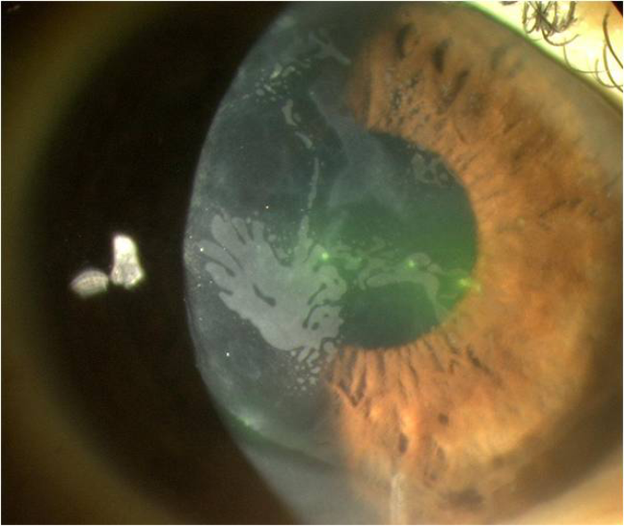 Figure 3a: Intractable fibrotic epithelial ingrowth with irregular astigmatism and peripheral stromal melting.