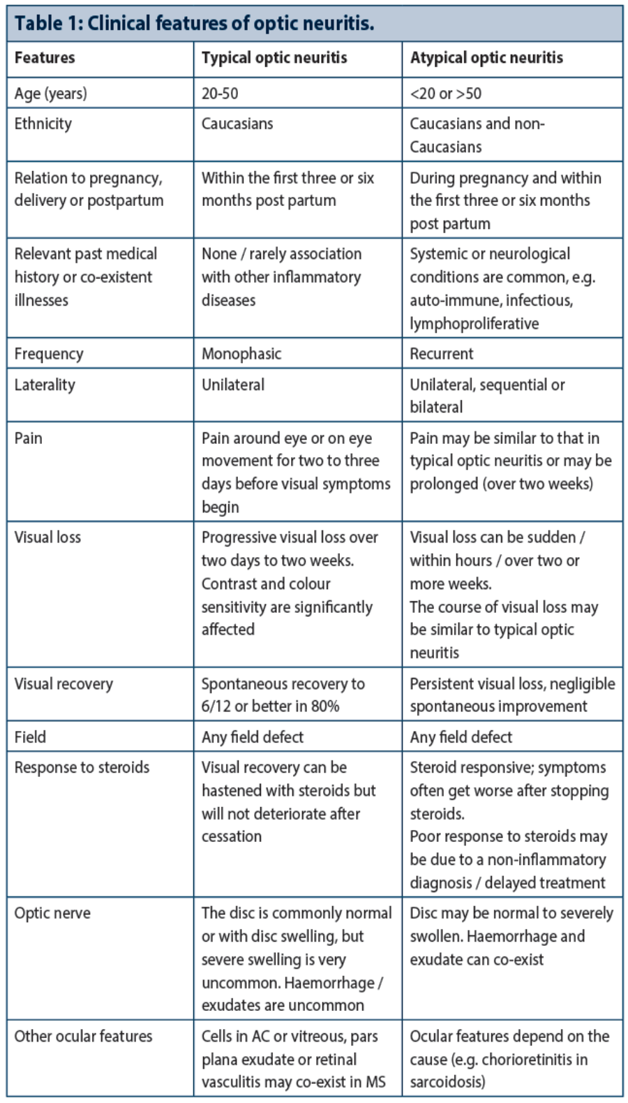 Optic neuritis is a relatively common presentation to ophthalmologists in the acute setting. The vast majority are cases of ‘typical’ optic neuritis (ON) but a smaller group of conditions, so-called, ‘atypical’ optic neuritides require a different work-up and management strategy. Selection of the correct management paradigm can significantly affect visual outcomes in some cases. The objective of this article is to help you make the clinical distinctions between typical and atypical optic neuritis.