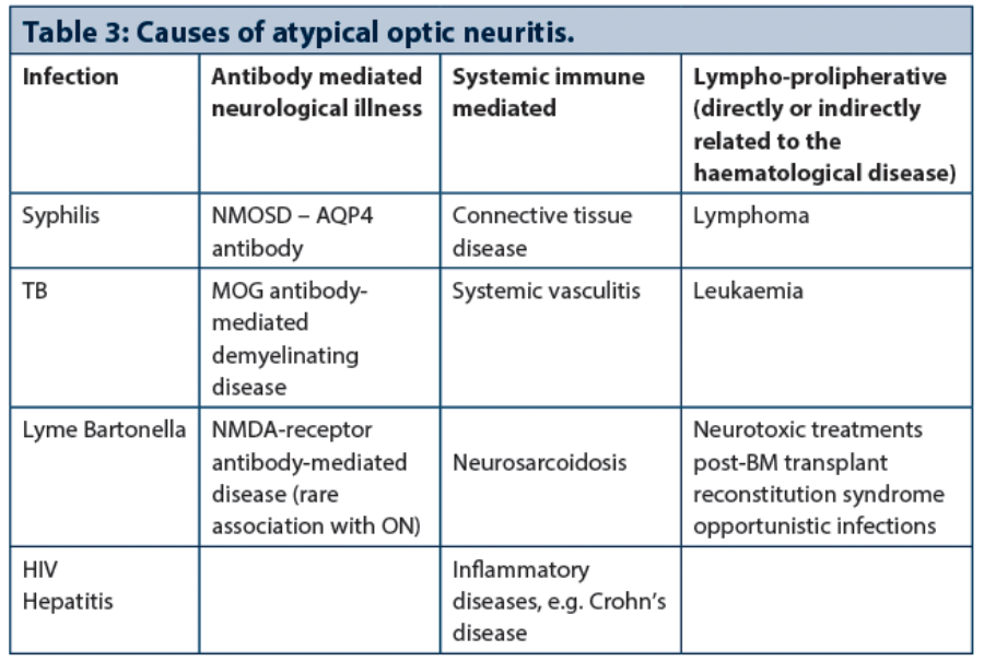 Table 3 contains four main subgroups of causes of atypical ON and the conditions listed are just some of many that may cause atypical ON.