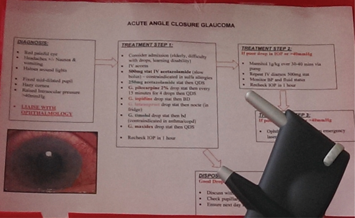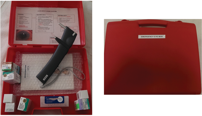 Once the box was assembled, a training session was arranged at the emergency department allowing us to introduce and promote the box, train emergency nurse practitioners and doctors on the use of the iCare tonometer and provide education on the presentation, pathophysiology and acute management of acute angle closure.