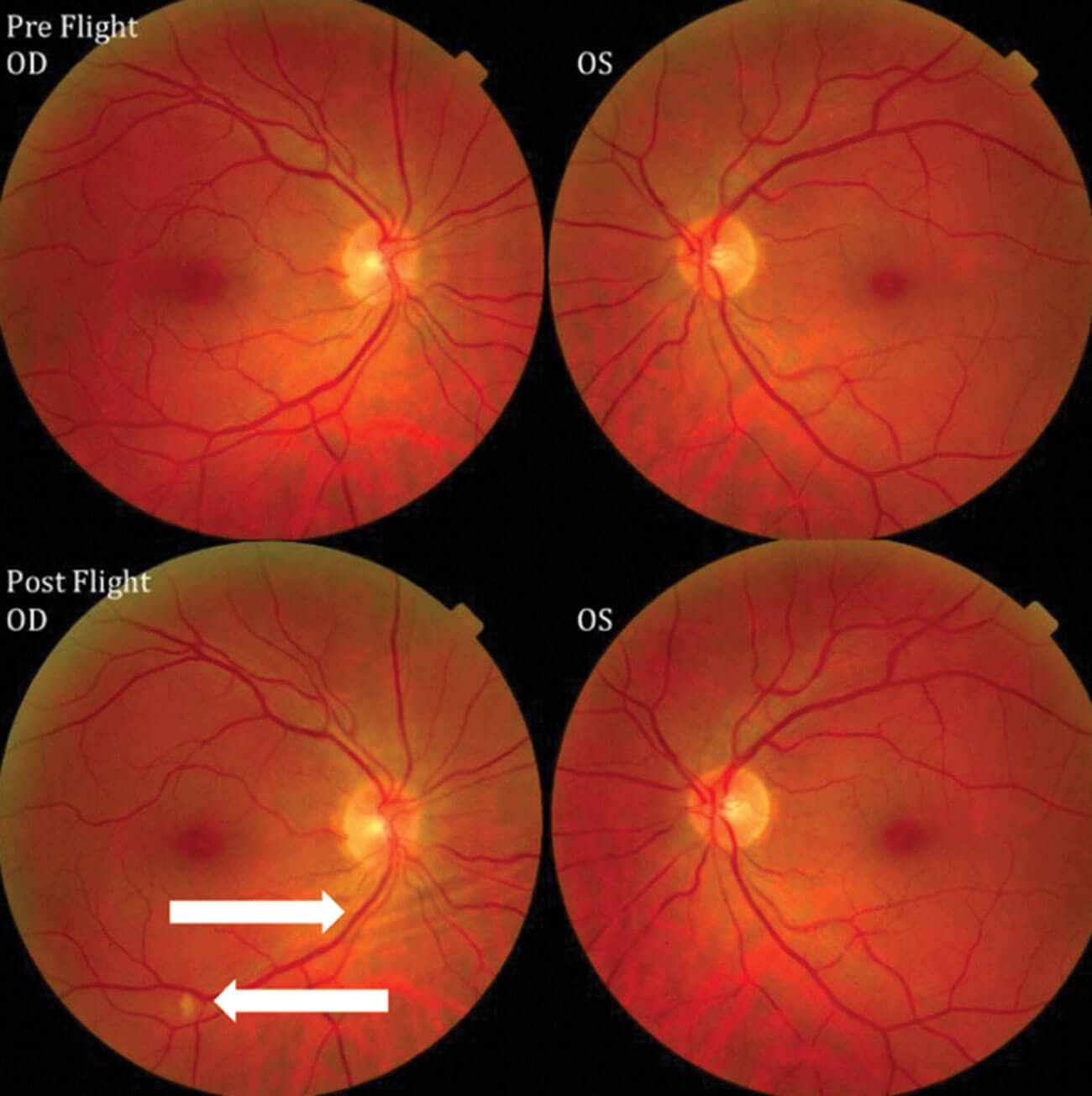 Figure 1: Fundus examination of first case of vision changes from long-duration spaceflight. Fundus examination revealed choroidal folds in inferior to the optic disc (right-pointing arrow) and a single cotton wool spot (left-pointing arrow) in the inferior arcade of the right eye. Source: NASA Risk of Spaceflight Associated Neuro-ocular Syndrome Evidence Report.
