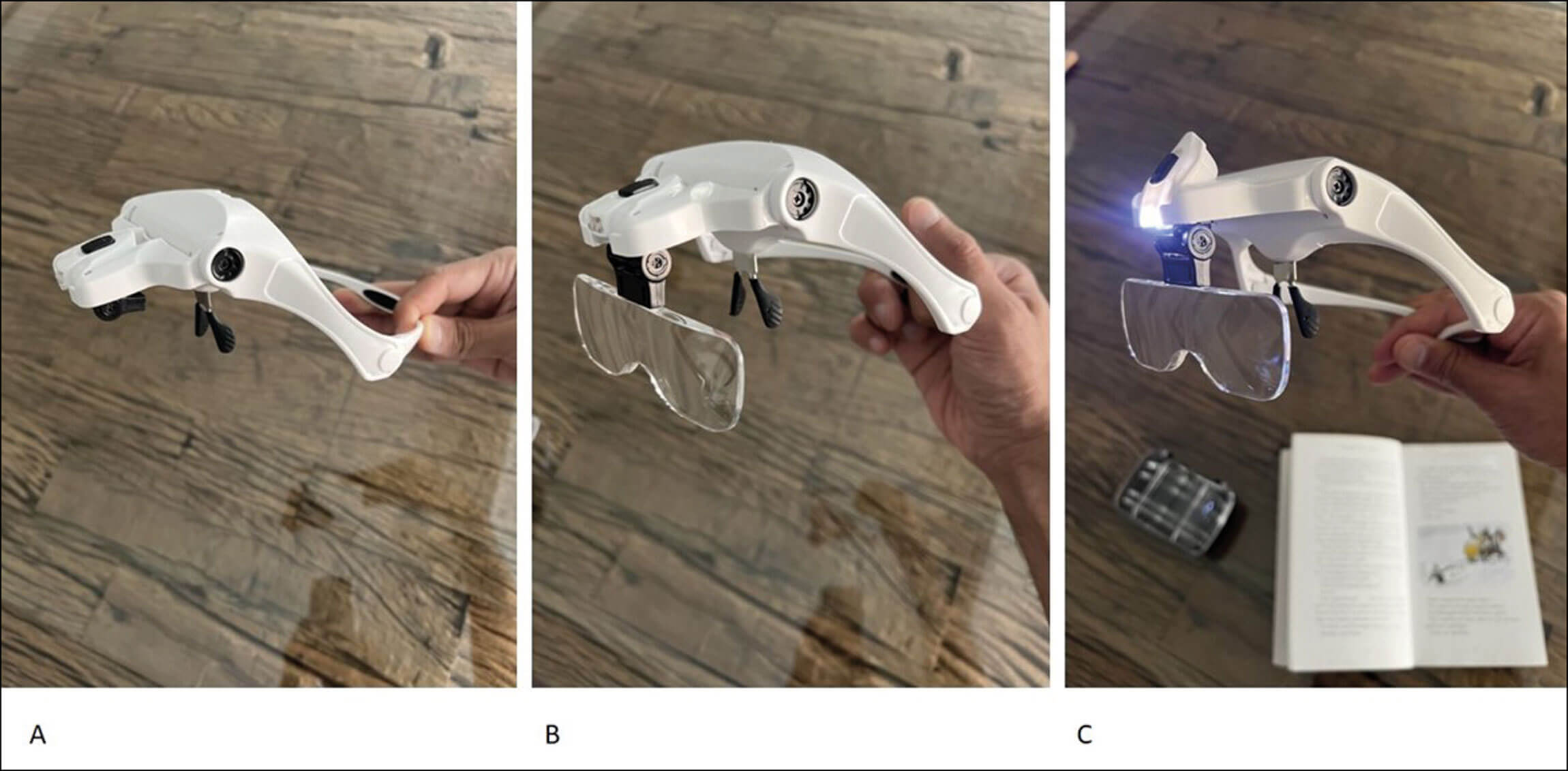 Figure 1: (A) frame only, (B) with lens inserted (C) with LED light.