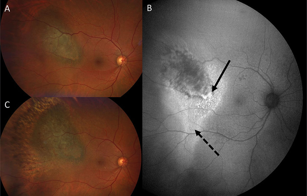 Figure 2: A: Right choroidal melanoma (AJCC Stage 1); B: Fundus Autofluorescence highlights lipofuscin (solid arrow) and subretinal fluid (dash arrow).C: Six months after Ruthenium Plaque Brachytherapy, choroidal melanoma shows surrounding post-radiation atrophy. Following treatment, thechoroidal lesion thickness decreased on BScan Ultrasound and subretinal fluid resolved on Ocular Coherence Tomography (OCT).