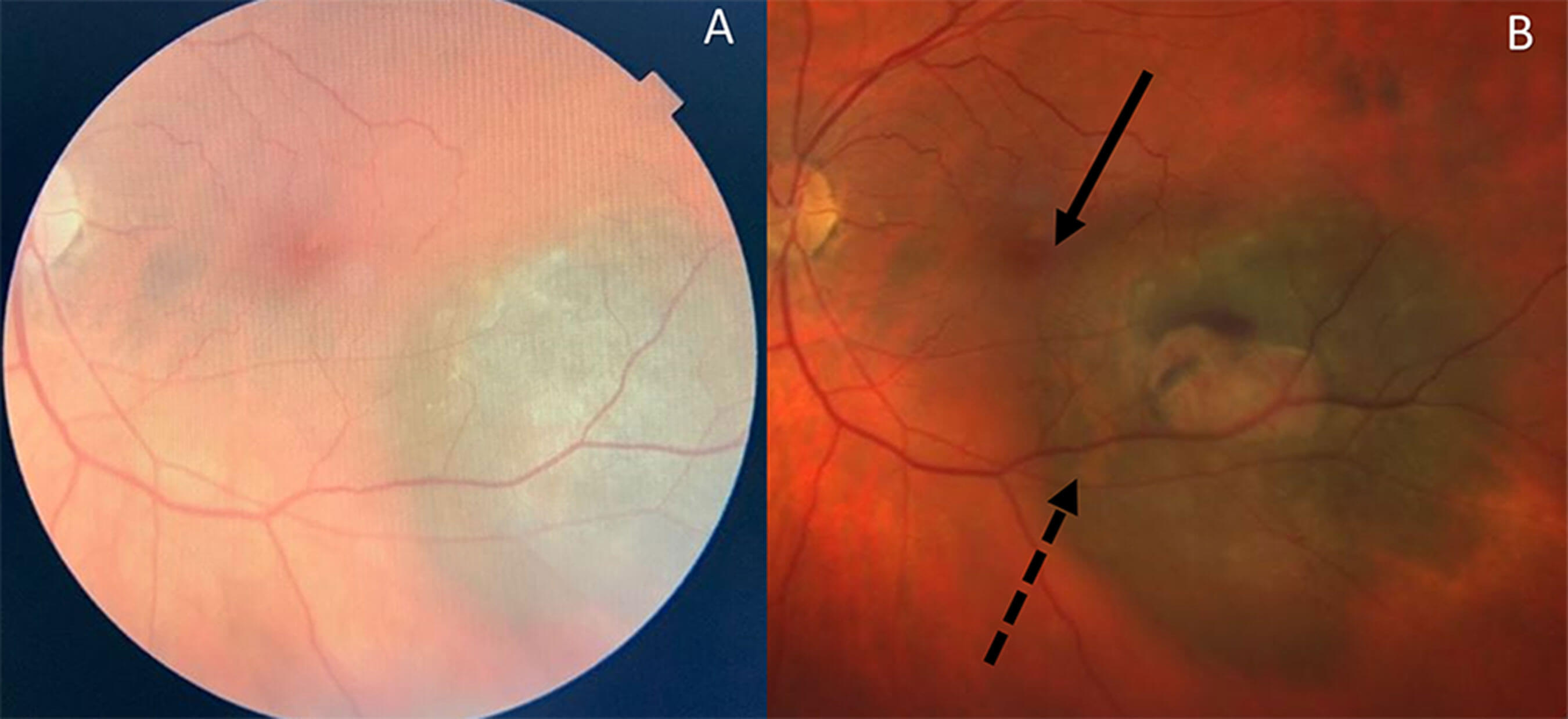 Figure 1: A: Optician fundus photograph with left indeterminate choroidal lesion; B: Following 10 years of observation, transformation into a left choroidal melanoma (AJCC Stage 1). Lesion enlarged towards fovea [solid arrow] causing visual symptoms. Orange pigment represents lipofuscin [dash arrow] which is a risk factor for transformation. [Note: fundus photographs are from different retinal imaging devices]