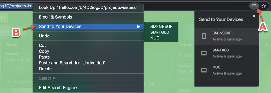 This tip is more for your home and mobile devices, rather than corporate devices. Chrome has recently added some features allowing clipboard and tab sharing between devices. This might be from a Mac to PC or between desktop and mobile. On PC or Mac, the way to share a website is to select the tab and then press the share tab button (‘A’ on Figure 1) or right click on the address and choose ‘Send to your devices’ (‘B’ on Figure 1). Other versions of Chrome that you are logged into (regardless of device) will appear on the list for you to select. After choosing one, a notification will appear on that device which will open the same website on the fellow device. Sending text (or clipboard share) is done in a similar way. Highlight a chunk of text on a website in Chrome on PC or Mac and then right click. If activated, you should see a ‘Copy to your device’ menu item (Figure 2).