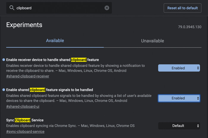 Tab sharing is typically enabled by default, but clipboard sharing may need enabling manually. Chrome is updated frequently, making it difficult to determine if readers will need to go the extra step of enabling at the time of reading this. On a PC or Mac, the process of enabling is the same. In the address bar, type chrome://flags and press enter. In the search box that appears, type ‘clipboard’. The three entries that appear should be enabled for the service to work (Figure 3). On Android, the process of enabling is the same, though there are fewer entries to enable.