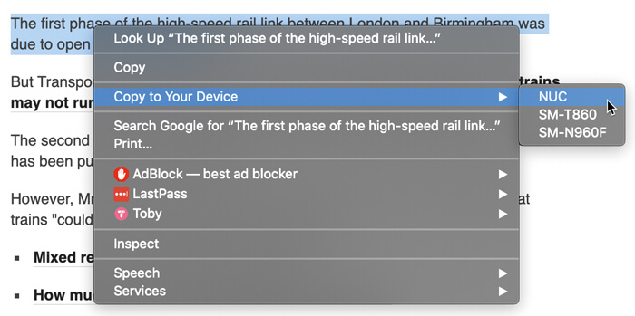 Again, choose the recipient device and wait for the notification. Once received, the text will have been copied into the clipboard for pasting wherever you want. At the time of writing (February 2020) PC, Mac, Linux and Android can receive and send shared tabs and text, but not iOS (iPhone / iPad). This is likely due to security restrictions in place on those devices, but the features may appear in the future. To send a tab from Android Chrome, simply press the share button and choose ‘Send to device’. To share text using clipboard share, highlight the text and again choose ‘share’ from the Chrome menu. Choose the option ‘Send text to your devices’ and then pick a device. A notification will appear on the receiving system and the text will be in the clipboard ready to paste.