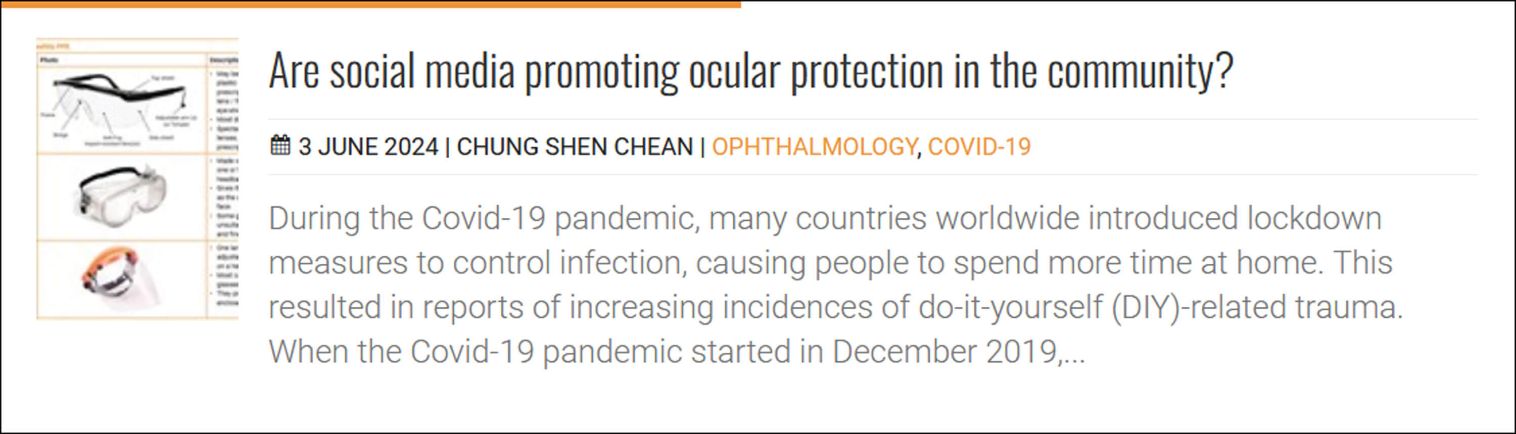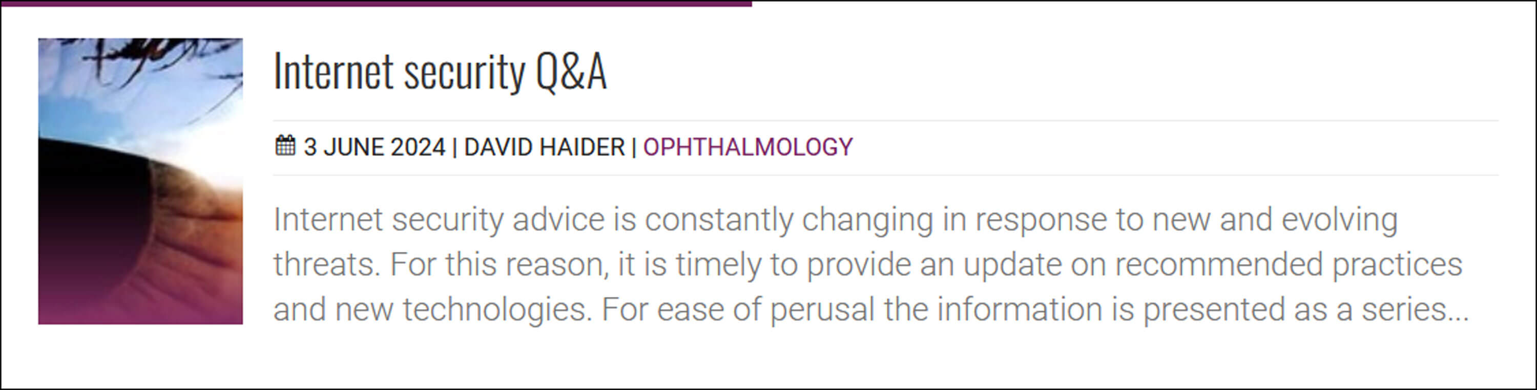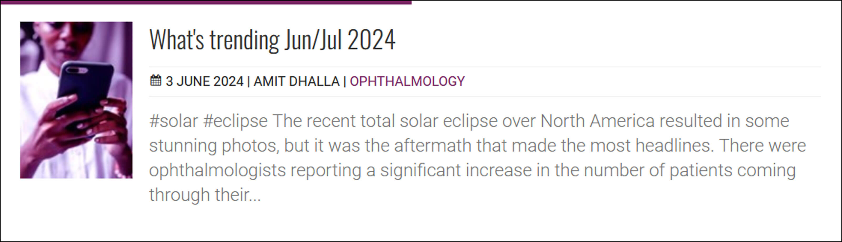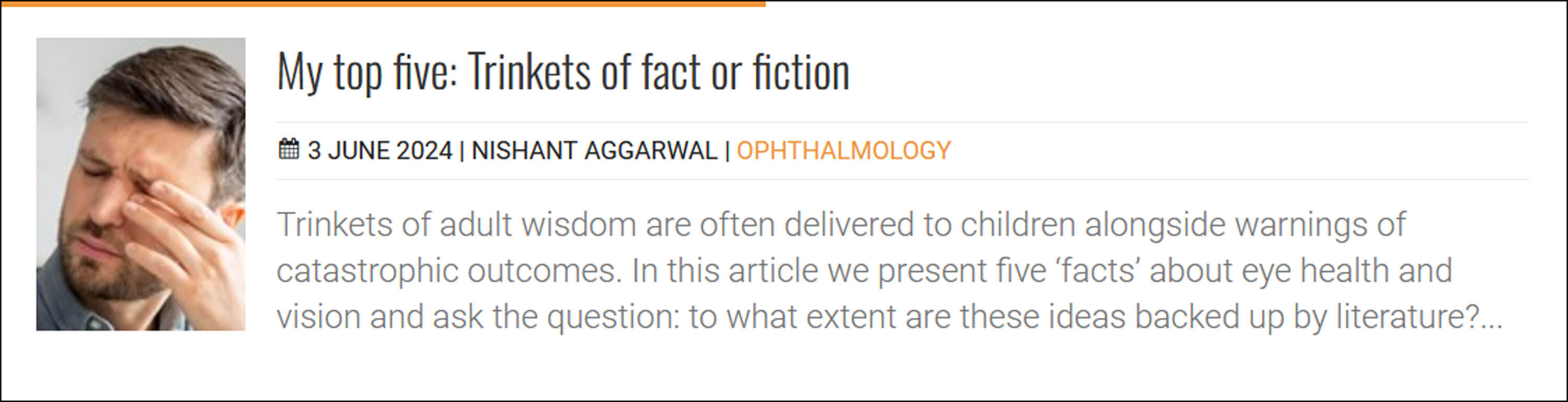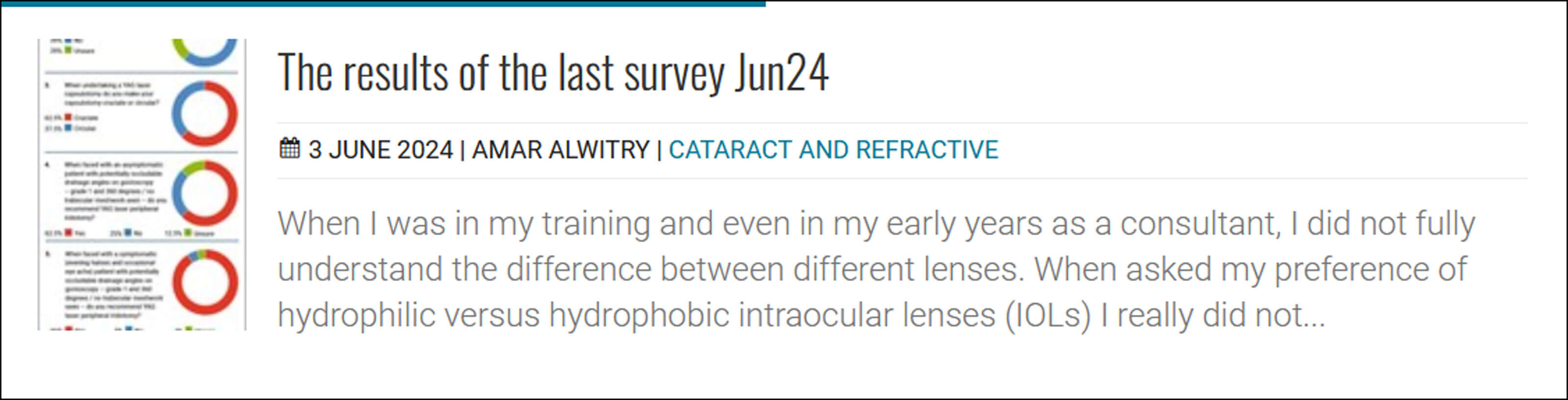 However, this expectation relies on you the readers also acting as authors in the future. Eye News is an excellent forum for sharing ideas and views in ophthalmology, and I would therefore encourage any budding writers amongst you to get typing and send your submissions in! I can guarantee it will get more reads than most of the articles in the high-impact ophthalmology journals out there. My research publication rant can wait for another time.