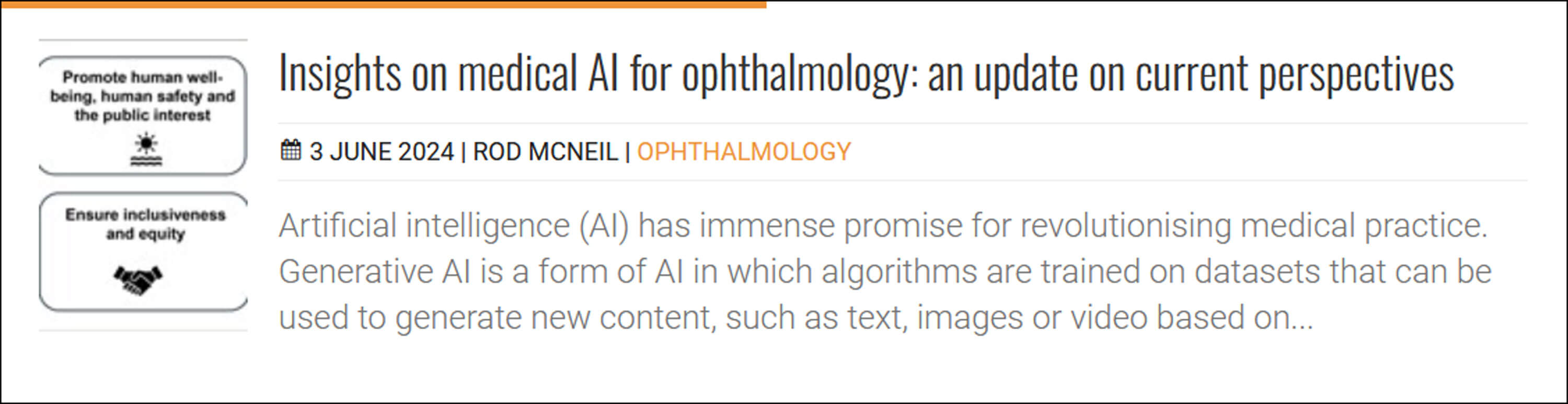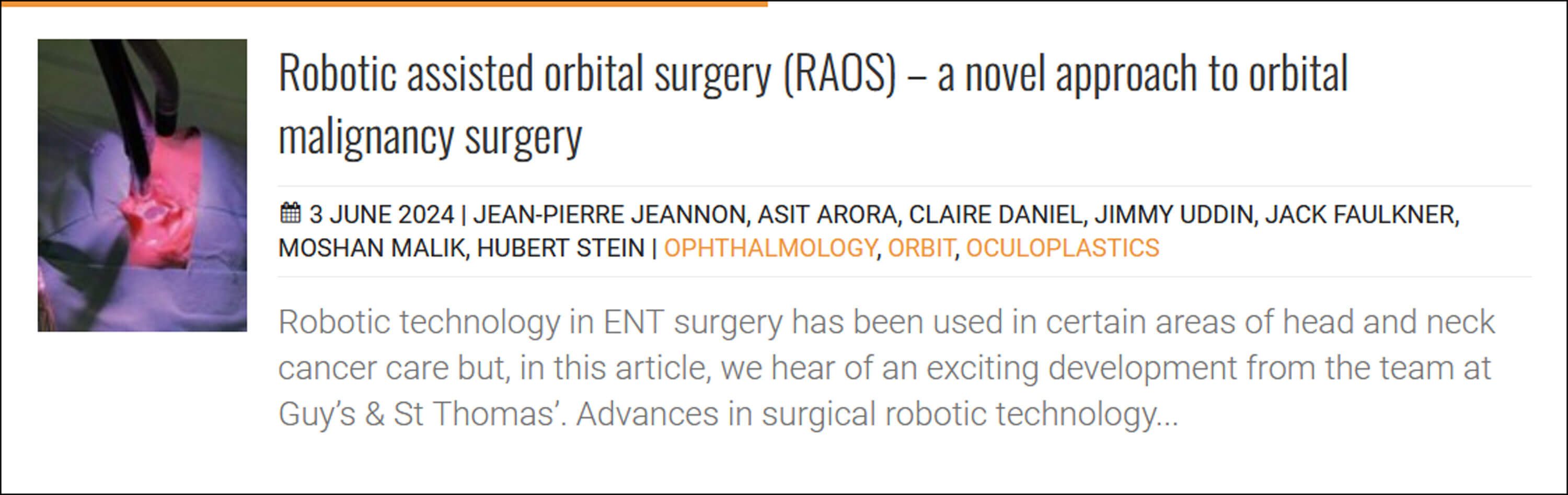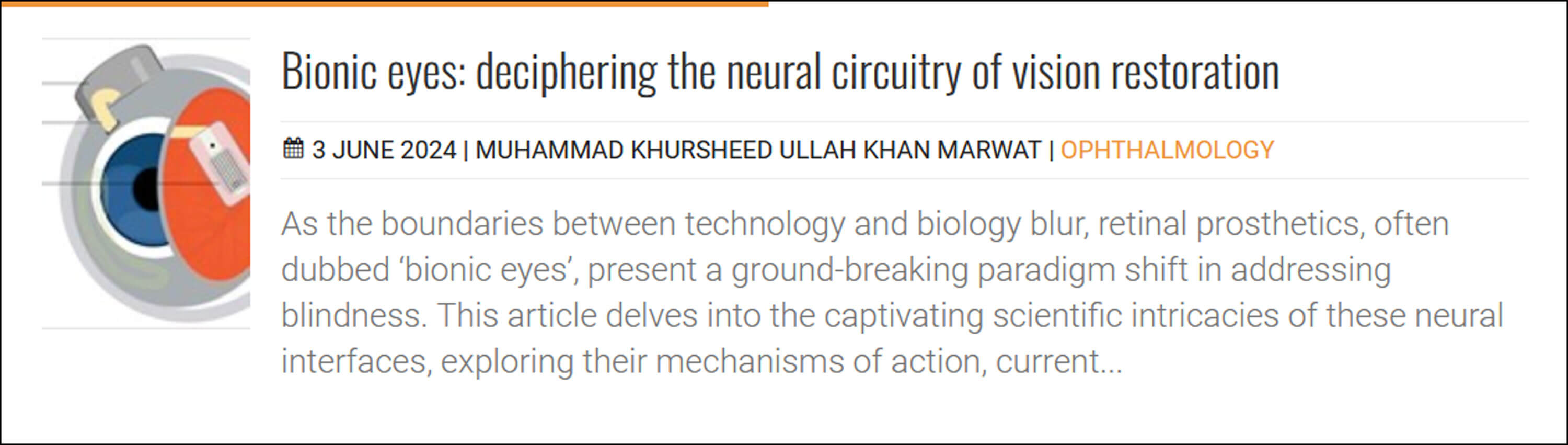 Over the last three decades since its inception, Eye News has been enormously successful, steadily growing in size and circulation and this is undoubtedly due to the quality of the publication. For June/July 2024, we have some great content with a particular focus on technology, including Andrew’s breakdown of the Arclight device, Rod covering AI in clinical practice, and Jean-Pierre discussing a novel approach to robotic assisted orbital surgery. Muhammad deciphers bionic eyes and the neural circuitry of vision restoration while Yu and Matthew discuss smartwatches on the new frontier of ophthalmology. With the usual suspects including Top 5, Tech Review, Eye on Art, and Bogus Pete, once again there is plenty to stimulate the mind.