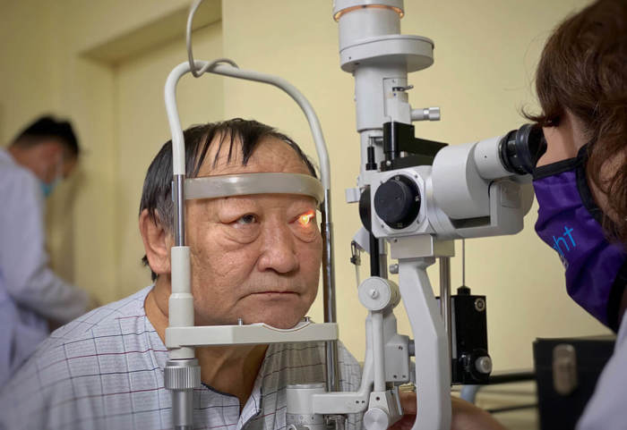 A patient is screened in Ulaanbaatar, Mongolia, following a successful cataract operation that took place following Orbis training.