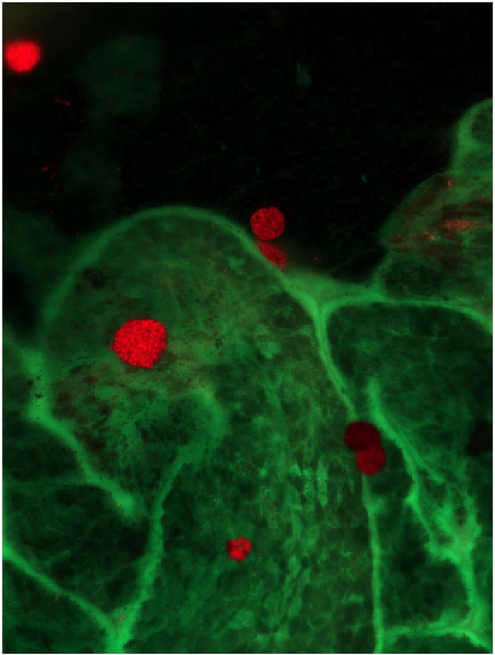 (b) Attached immune cells (red) on the ciliary body (green) in a flatmount preparation.